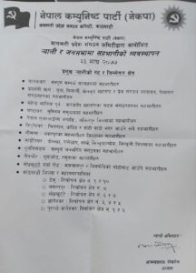 प्रदेश कमिटीको यही माघ ६ गतेको बैठकले कमिटी पुनःगठन गरी सचिव आनन्दप्रसाद पोखरेललाई अध्यक्ष र निवर्तमान सांसद खेमप्रसाद लोहनीलाई सचिवमा चयन गरेको थियो। प्रधानमन्त्री केपी शर्मा ओलीले प्रचण्ड–माधव पक्षले काठमाडौंमा गरेको शक्ति प्रदर्शनलाई ‘सामान्य भन्दै २३ गते वास्तविक जनप्रदर्शन हुने दावी गरेका थिए। गत पुस ५ गते प्रतिनिधिसभा विघटन भइ आगामी वैशाख १७ र २७ गतेका लागि निर्वाचन तोकिएको छ।