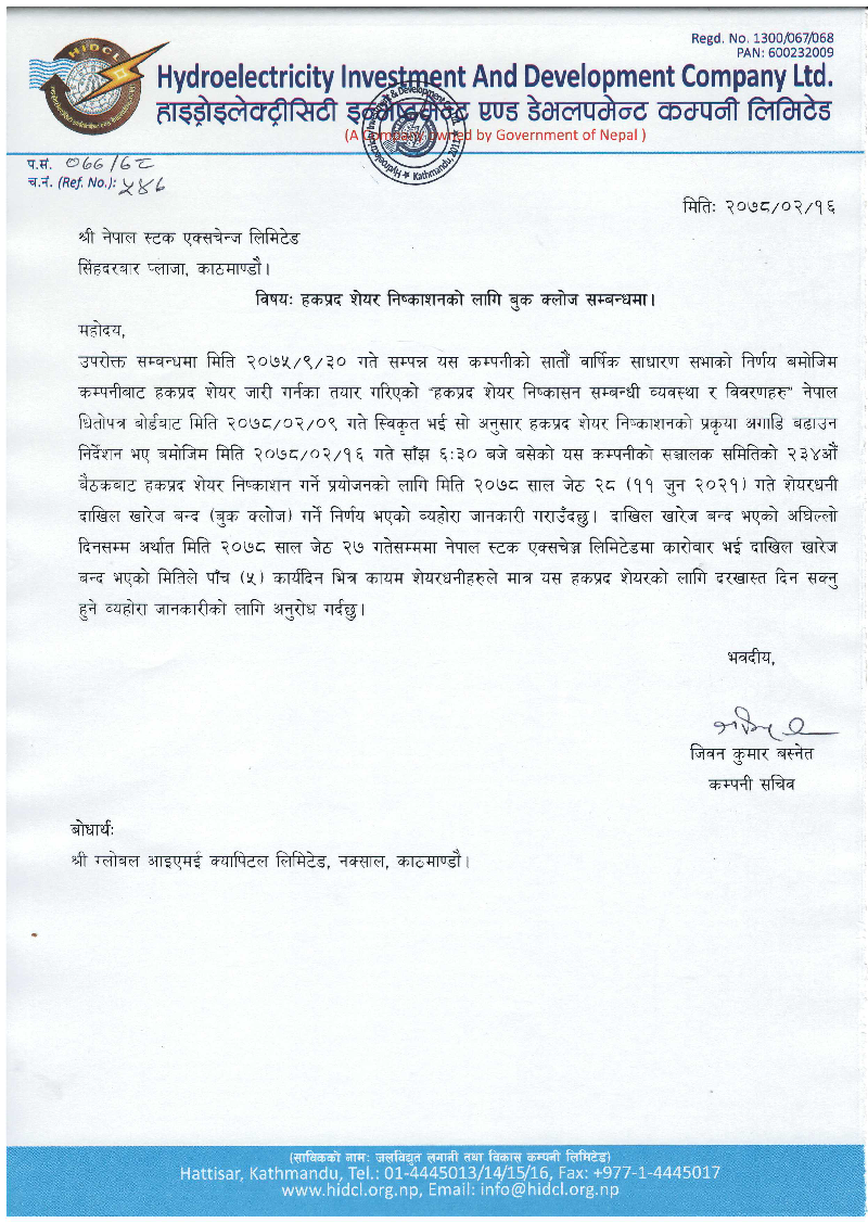 हाइड्रोइलेक्ट्रिसिटी इन्भेष्टमेन्ट एण्ड डेभलपमेन्ट कम्पनी लिमिटेड (एचआईडिसिएल) (HIDCL) ले हकप्रद प्रयोजनको लागि बुक क्लोज मिति तय गरेको छ ।