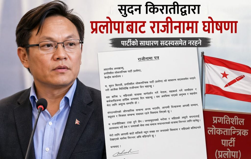 प्रगतिशील लोकतान्त्रिक पार्टी (प्रलोपा) का नेता सुदन किरातीले पार्टीको साधारण सदस्य समेत नरहने गरी राजीनाको घोषणा छन् । बुधबार सामाजिक सञ्जाल फेसबुकमार्फत उनले पार्टीसँगको करिब ५ महिना लामो यात्रा टुङ्ग्याएको घोषणा गरेका हुन् ।