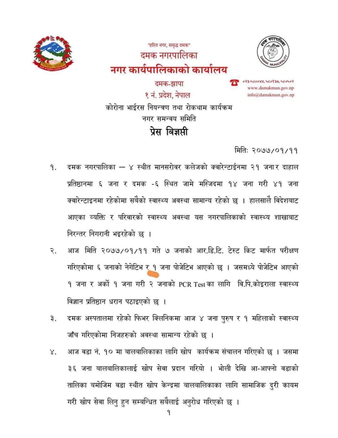 नगरपालिकाले आज जारी गरेको प्रेस बिज्ञप्तीमा जनाइए अनुसार आज नगरका ३ स्थानमा रहेका क्वारेन्टाइनहरुमा कुल ४१ जनालाइ राखेर उनीहरुको स्वास्थ्य अवस्था बारे निगरानी जारी राखिएको छ । ती मध्ये दमकको जामे मस्जिदमा १४, मानसरोवरको क्वारेन्टाइनमा २१ र बाकी दाहाल प्रतिस्ठानको क्वारेन्टाइनमा रहेका छ्न । जामे मस्जिदमा यश अघि क्वारेन्टाइन स्थापना भएको सार्वजनिक गरिएको थिएन । त्यहा राखिएका १४ जना दमक बाहिरबाट ल्याइएको भन्दै स्थानीयहरुले भने गम्भीर आपत्ति जनाउदै आएका छन् । तर नगरपालिकाले भने उनीहरुलाइ अन्यत्रबाट ल्याएर यश अघि निर्धारण गरिएको क्वारेन्टाइनस्थलमा नलगि छुट्टै राख्नुपर्ने कारण स्पष्ट पारेको छैन ।