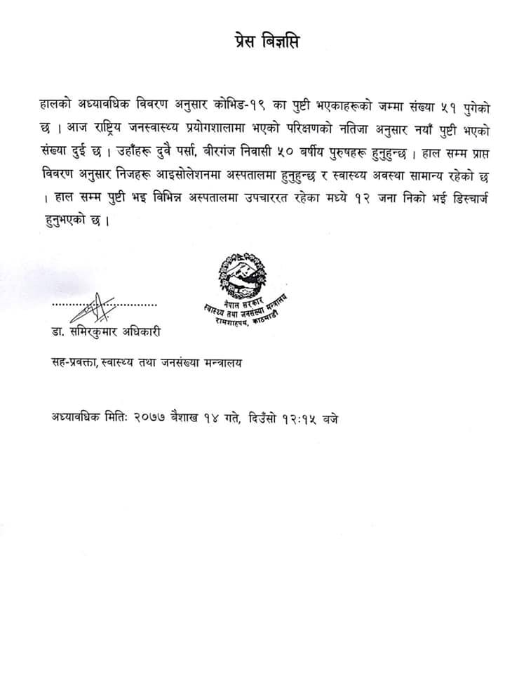 काठमाडौं । नेपालमा कोरोनाभाइरस संक्रमितको संख्या ५१ पुगेको छ ।