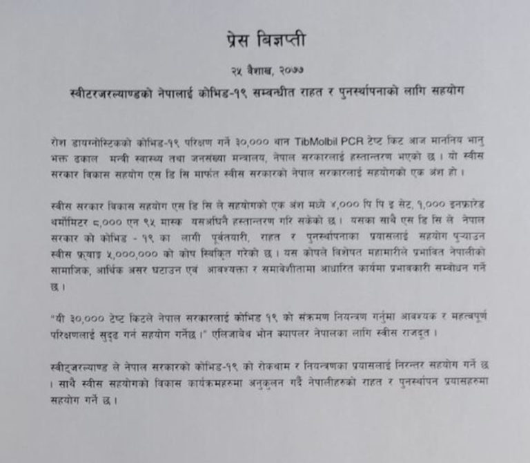 नेपालका लागि स्वीस राजदूत एलिजाबेथ भोन क्यापलरले ३० हजार किट सरकारलाई कोरोना भाइरस नियन्त्रण गर्न आवश्यक र महत्वपूर्ण परीक्षणलाई सुदृढ गर्न सहयोग पुग्ने विश्वास व्यक्त गरिन् ।