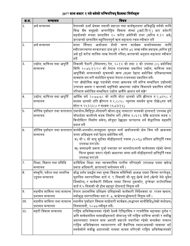 मन्त्रिपरिषद्को बैठकले औद्योगिक कच्चा पदार्थका रुपमा आवश्यक पर्ने मरिच आयात गर्न उद्योगलाई स्विकृति प्रदान गरेको छ। कलंकी-नागढुङ्गा सुरुङमार्ग आयोजनामा स्थलमा जग्गा भोगचलन गर्दै आएका मोहीलाई मूल्यको ५० प्रतिशत क्षतिपूर्ति उपलब्ध सरकारले गराउने भएको छ।