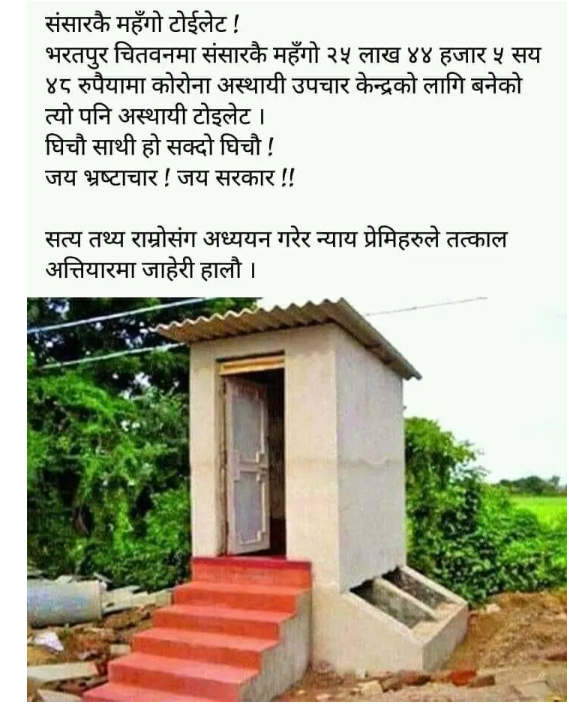 यसै क्रममा सरकारले कोरोना रोकथामकालागि स्थानीय स्तरमा कोरोना अस्थायी अस्पताल निर्माण गरी रहेको छ । चितवनको भरतपुरमा रहेको कोरोना अस्थायी अस्पतालमा निर्माण गरिएको एउटा सौचालयको निर्माण लागत २५ लाख ४४ हजार ५ सय ४८ रुपिया खर्च भएको बिवरण पेश गरिएको छ ।