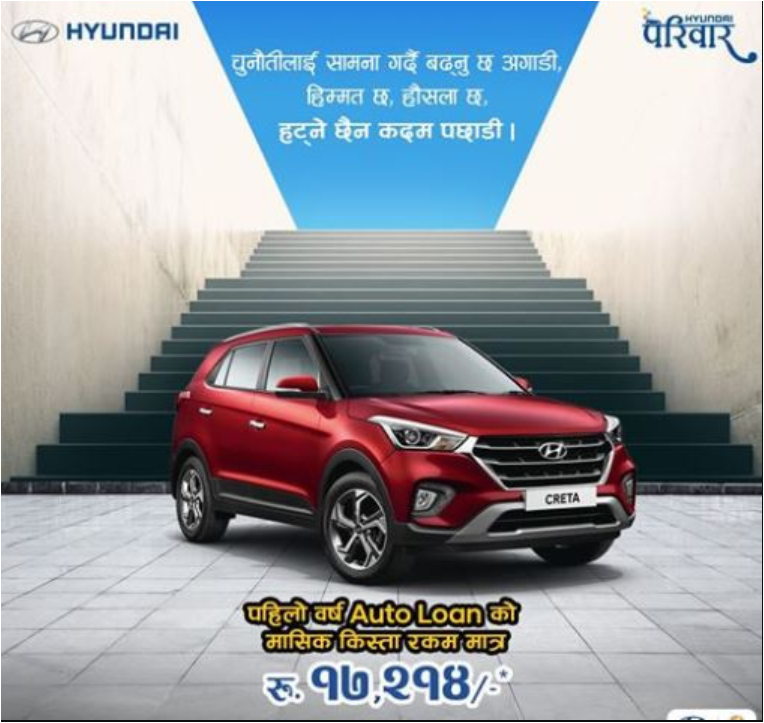 हुन्डाइ नेपालका लागि आधिकारिक विक्रेता लक्ष्मी इन्टरकन्टिनेन्टल प्रालिले क्रेटा किन्ने ग्राहकहरुका लागि नयाँ सुविधासहितको अफर ल्याएको छ। क्रेटा मासिक १७