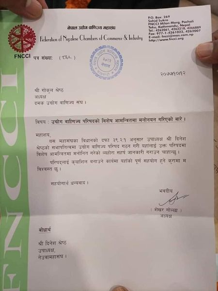 दमक उद्योग वाणिज्य संघका अध्यक्ष  गोकुल श्रेष्ठ, नेपाल उद्योग वाणिज्य महासंघको उद्योग वाणिज्य परिषद्को विशेष आमन्त्रित सदस्य पदमा मनोनित हुनु