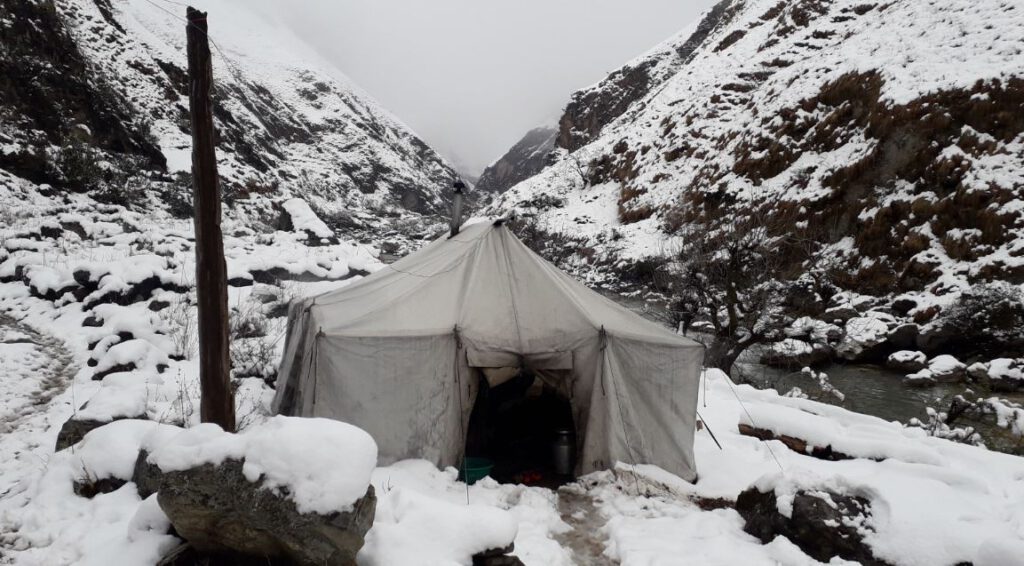 जाजरकोटको मुड्केचुला गाउँपालिका–४ मा उपल्लो डोल्पाबाट चिसो छल्न आएका सर्वसाधारणले बस्न बनाएको टेन्ट वरिपरि ढाकिएको हिउँ । गत वर्षहरुमा भन्दा
