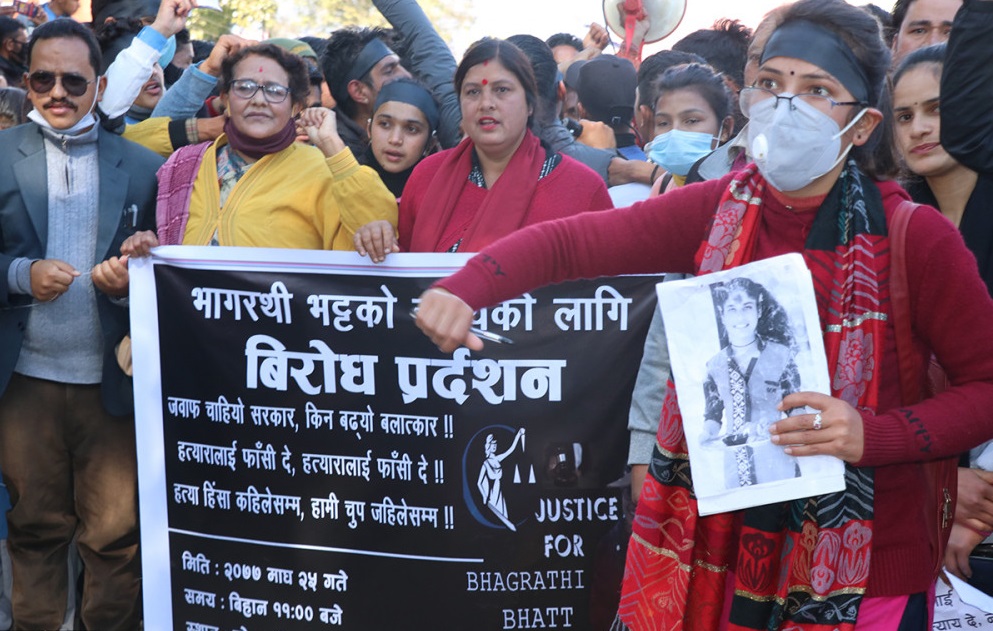 बैतडी — बैतडीको दोगडाकेदार गाउँपालिका–७ चडेपानीकी १७ वर्षीया भागरथी भट्टको न्यायका लागि आइतबार बैतडीमा प्रदर्शनहरु भएका छन् । जिल्लाका विभिन्न